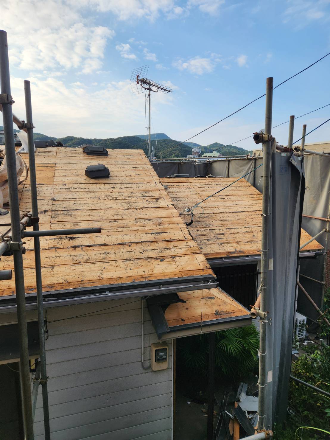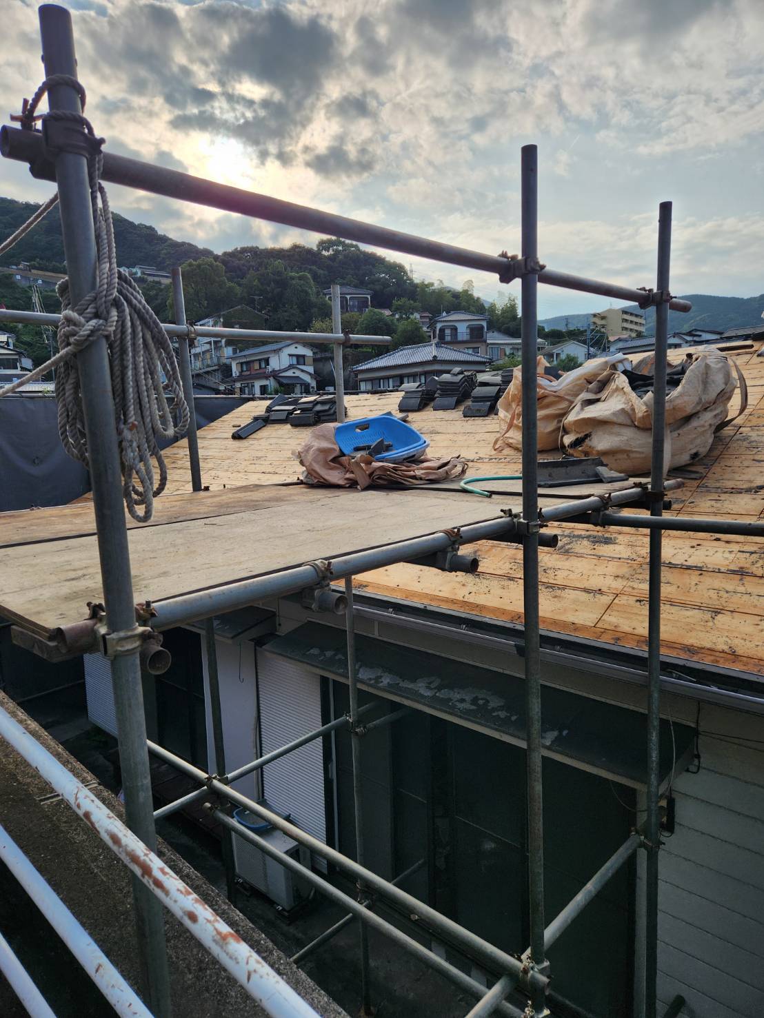 瓦屋根の為、まず1枚ずつ外してから建物を解体します。