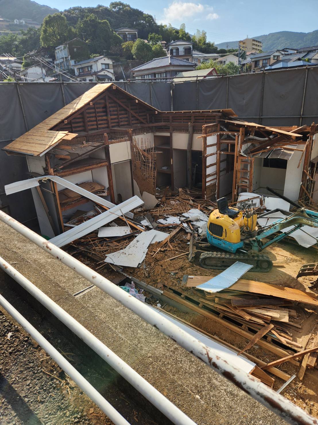 詳細:建物の主要な構造部分である柱や梁を、ミニユンボ(小型の油圧ショベル)で慎重に解体いたしました。