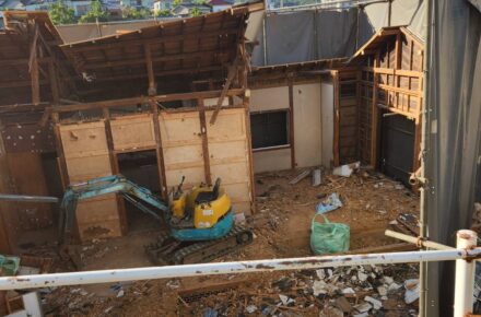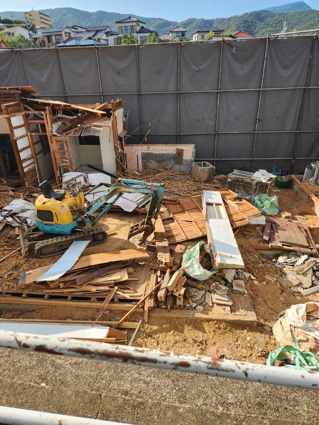 詳細:建物の主要な構造部分である柱や梁を、ミニユンボ(小型の油圧ショベル)で慎重に解体いたしました。